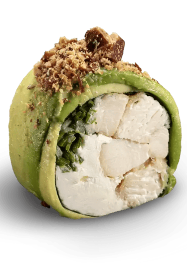 Pollo teriyaki, Queso crema y Cebollín (sin arroz), envuelto en palta y almendras picadas.